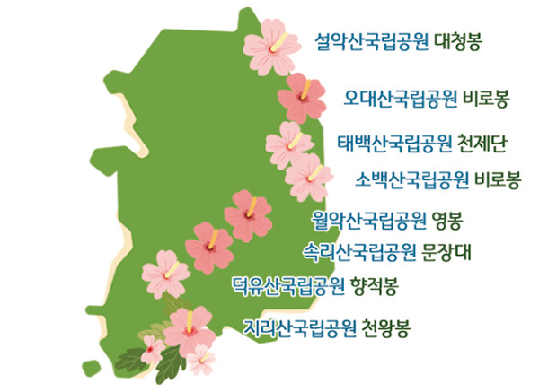 이번 행사는 ▲설악산 대청봉 ▲오대산 비로봉 ▲태백산 천제단 ▲소백산 비로봉 ▲월악산 영봉 ▲속리산 문장대 ▲덕유산 향정복 ▲지리산 천왕봉 등 백두대간이 지나는 8개 국립공원 정상에서 동시에 진행된다.