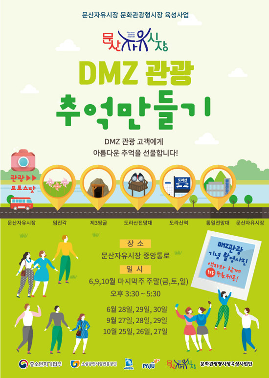 김종주 문산자유시장 문화관광형시장 육성사업단장은 “경기 최북단 문산자유시장에서 DMZ땅굴안보관광을 경험하고 그 추억을 액자에 담아가시길 바란다”며 “추억만들기 행사일 저녁에 열리는 DMZ야시장에도 많이 오셔서 먹거리와 버스킹 공연을 즐겨달라”고 말했다.