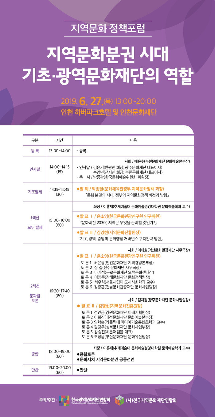 전국지역문화재단연합회(이하 전지연, 회장 손경년(부천문화재단 대표이사))와 한국광역문화재단연합회는 (이하 한광연, 회장 김윤기(광주문화재단 대표이사)) 공동으로 6월 27일 오후 2시 인천 베스트웨스트 하버파크호텔 그랜드불룸에서 ‘지역 문화분권시대 기초·광역문화재단의 역할’이라는 주제로 지역문화 정책포럼을 개최한다.