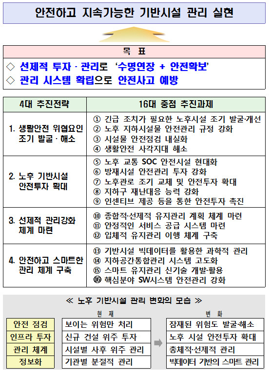 정부는 18일 이런 내용을 포함한 ‘지속가능한 기반시설 안전강화 종합대책’을 국무회의에서 확정해 발표했다.