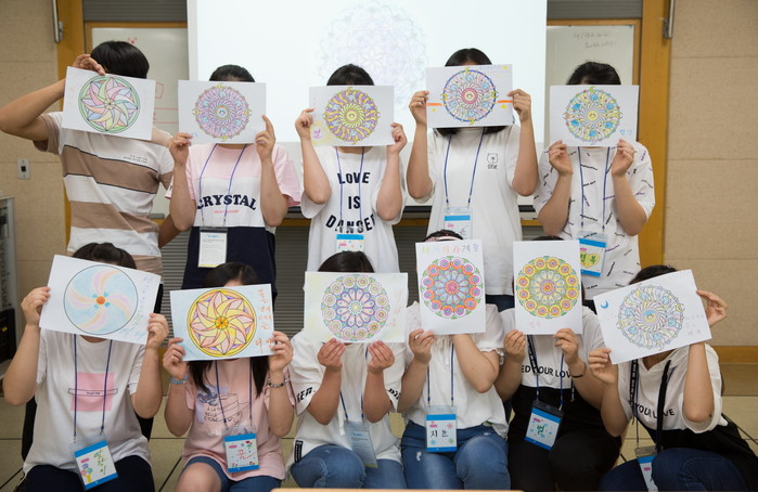 | ▲국립중앙청소년수련원 북한이탈청소년하나둘캠프 참가 청소년들이 만다라프로그램 중 작품을 들고 사진촬영 하고 있다. |