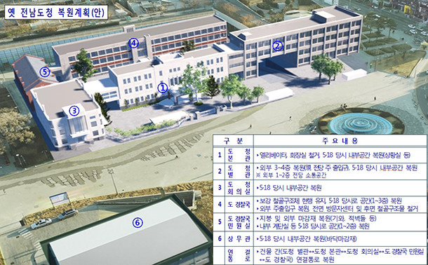복원 대상은 전남도청 본관·별관·회의실, 도 경찰국 및 도 경찰국 민원실, 상무관 등 6개 동이다.