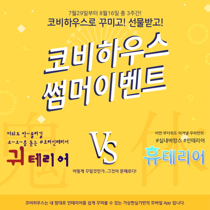 이번 이벤트는 3D VR 인테리어 꾸미기 앱인 ‘코비하우스 꾸미기’ 앱을 이용하여 무더운 여름에 어울리는 공포스러운 콘셉트의 인테리어 공간이나 ‘휴가’하면 떠오르는 계곡, 바다, 시원한 호텔 등이 연상되는 인테리어 공간을 나만의 스타일로 직접 꾸며 ‘코비하우스’ 앱에 공유하면 된다. 참여자 중 매력적인 작품을 만든 6인을 선정하여 다양한 상품을 제공한다. 참여기간은 7월 29일부터 8월 16일까지 진행되며, 당첨자는 8월 30일 코비하우스 앱을 통해 확인할 수 있다.