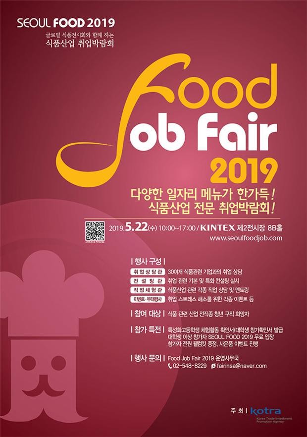 대한무역투자진흥공사(사장 권평오, 이하 KOTRA)가 22일 일산 킨텍스 제2전시장에서 식품산업 분야 일자리 매칭 지원을 위한 식품산업 취업박람회 ‘서울 푸드 잡페어 2019(SEOUL FOOD 2019 Job Fair)’를 개최한다고 14일 밝혔다.