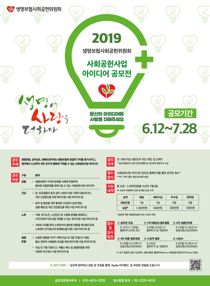 생명보험사회공헌위원회(공동위원장 신용길 생명보험협회 회장·이경룡 서강대 명예교수, 이하 위원회)는 생명보험에 대한 소비자 신뢰제고와 건전한 생명보험 문화 확산을 위해 ‘2019 생명보험사회공헌위원회 사회공헌사업 아이디어 공모전’을 개최한다고 12일 밝혔다.