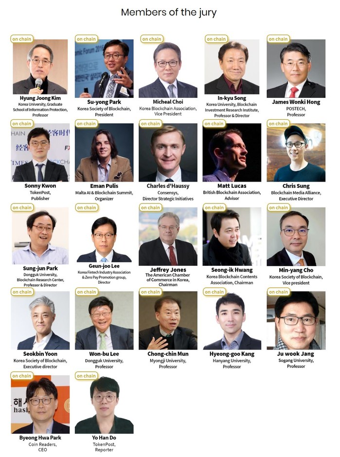 심사위원단은 블록체인 업계와 협회, 학계, 미디어 등 다양한 분야에서 전문성과 대표성을 인정 받은 국내외 전문가 21명이 참여해 심사를 진행했다. 김형중 고려대 정보보호대학원 교수를 심사위원장으로, 박수용 한국블록체인학회장, 마이클 최 한국블록체인협회 부회장 등 다양한 분야의 전문가들이 심사에 참여했다.