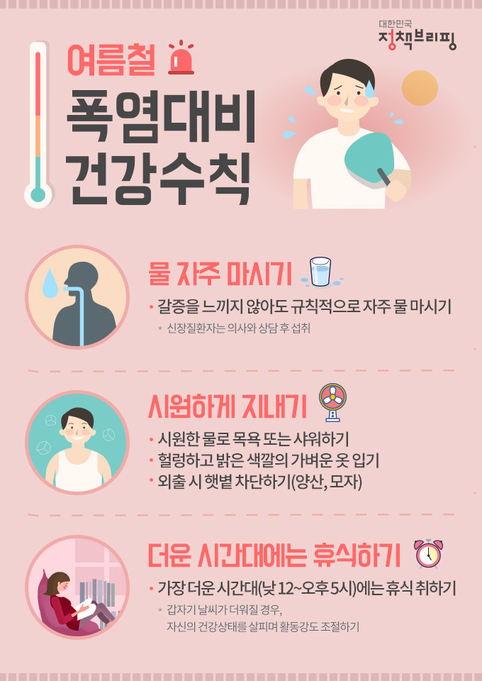 · 무더위에는 카페인이 들어간 음료나 주류는 삼가고, 생수나 이온음료를 마시는 것이 좋습니다.